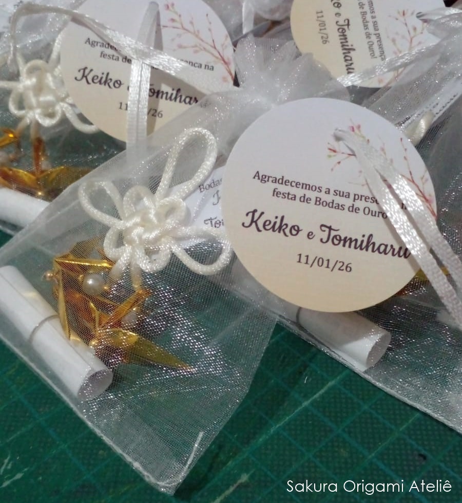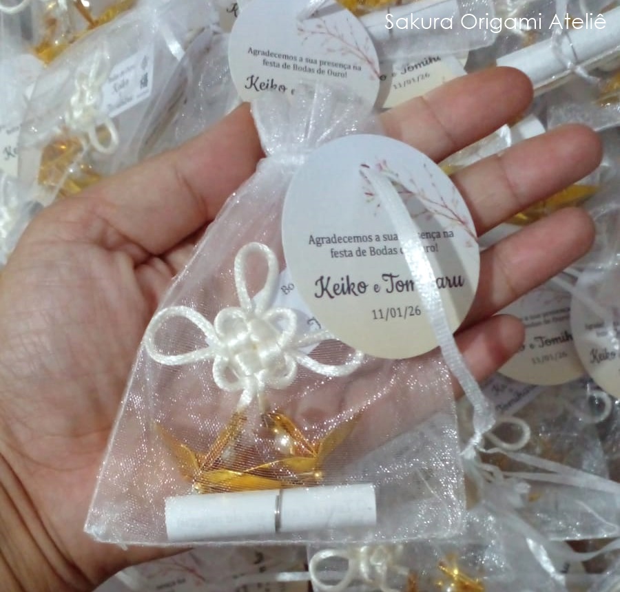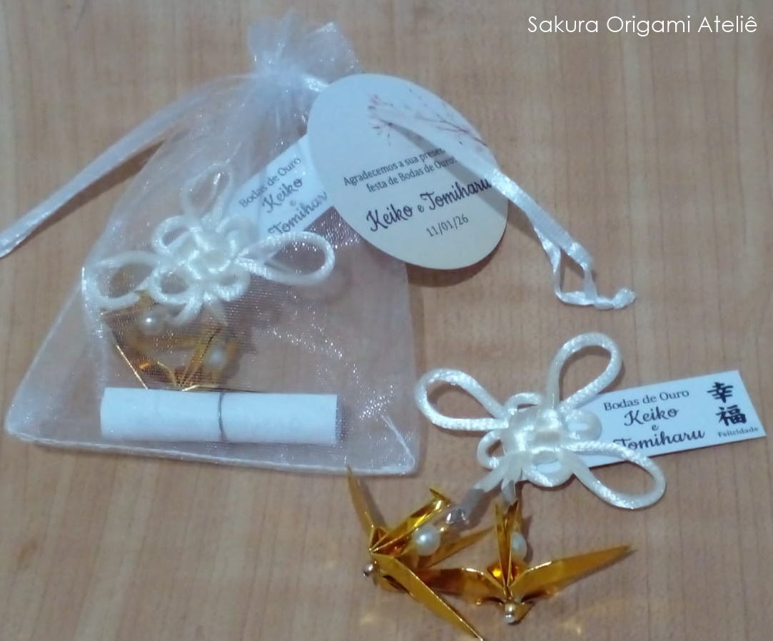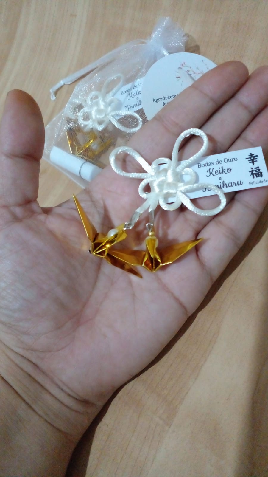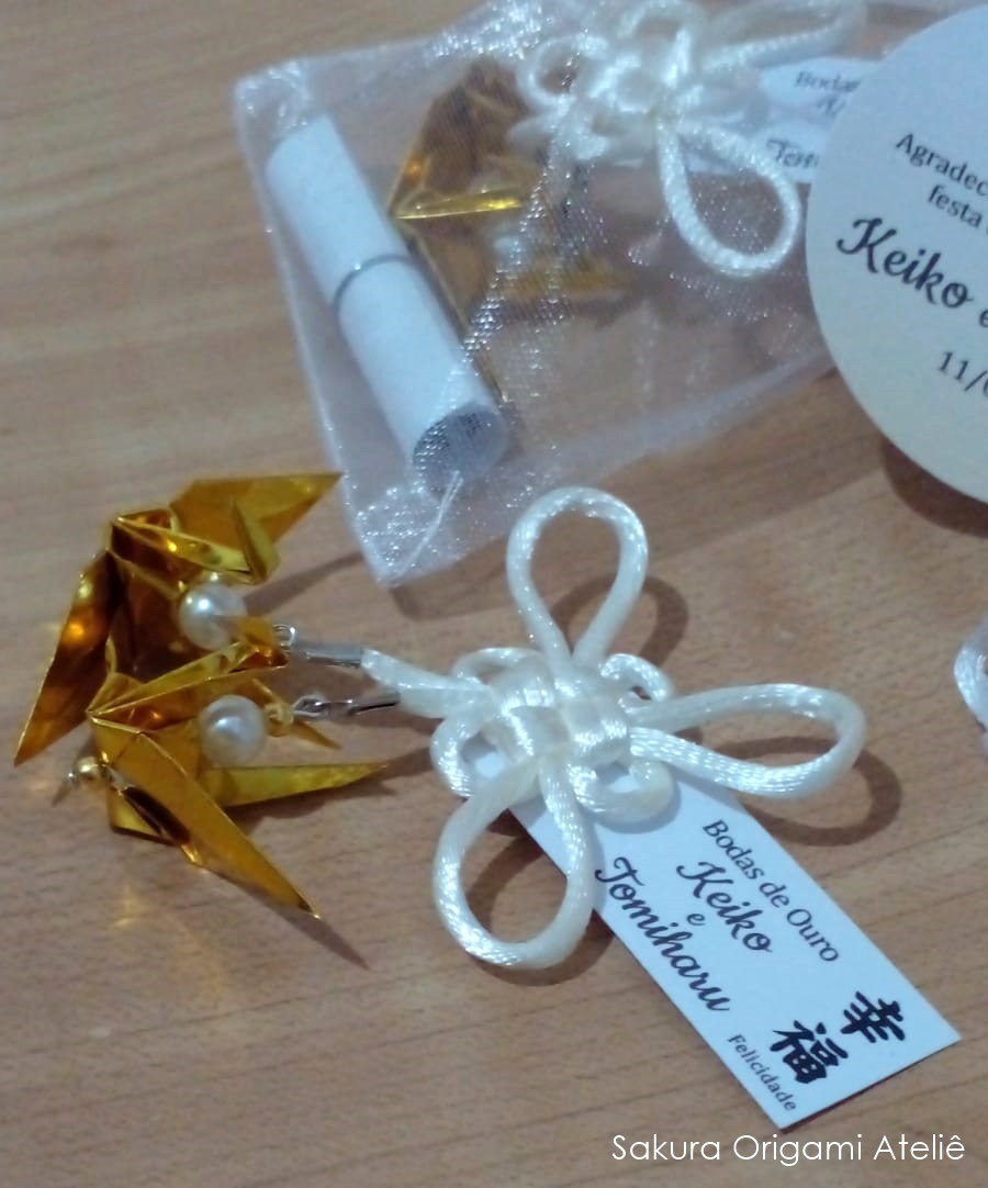 “O Tsuru é uma ave de origem japonesa e sua figura é uma das mais populares e belas dentro do origami, simbolizando a Paz, a Saúde, a Longevidade e a Fortuna. O nó chinês significa boa sorte.”