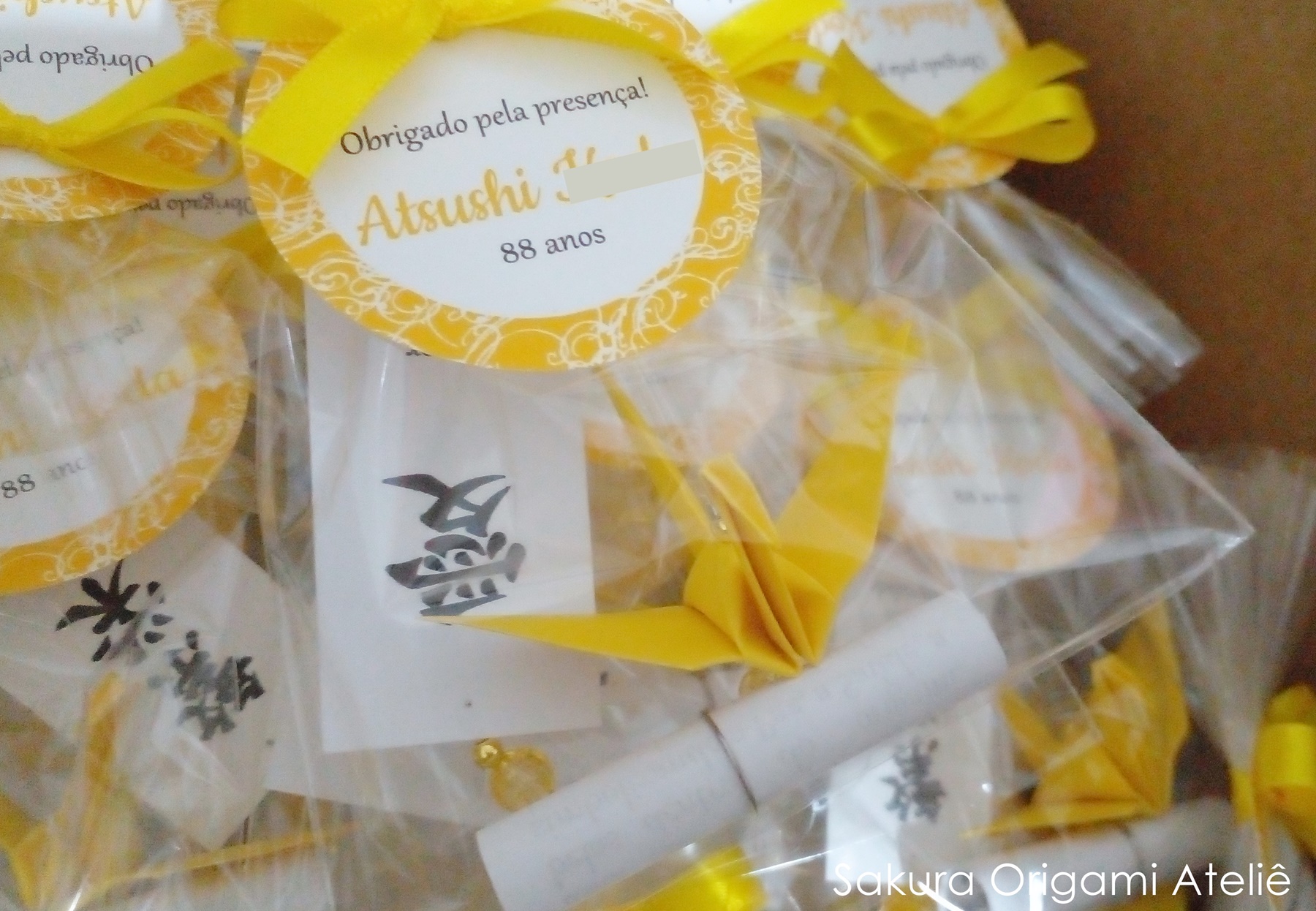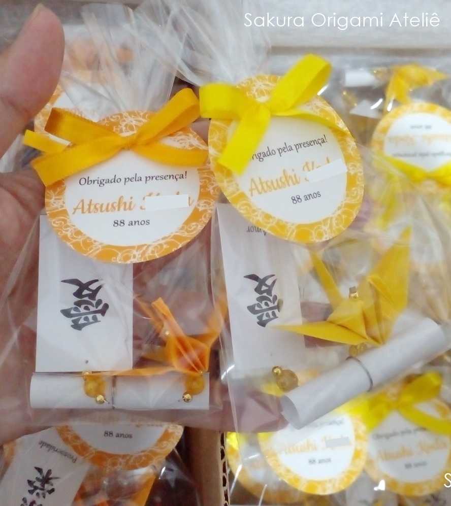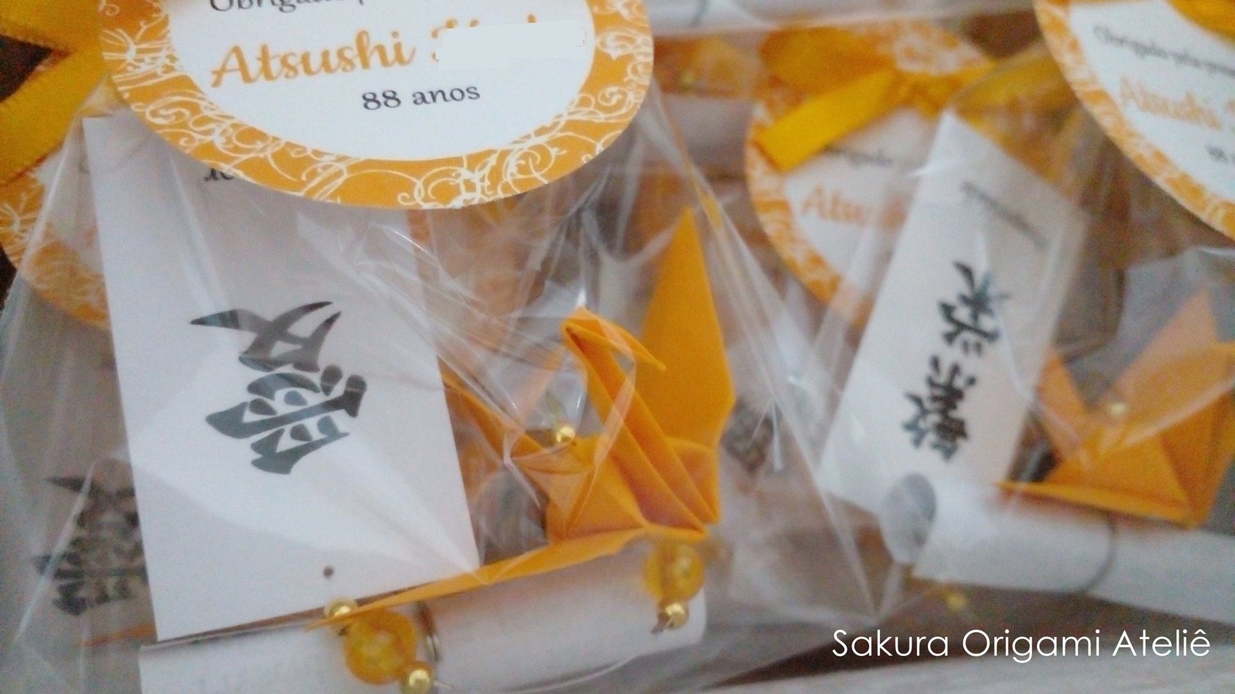 ímã de tsuru com plaquinha no saquinho transparente * 88 anos