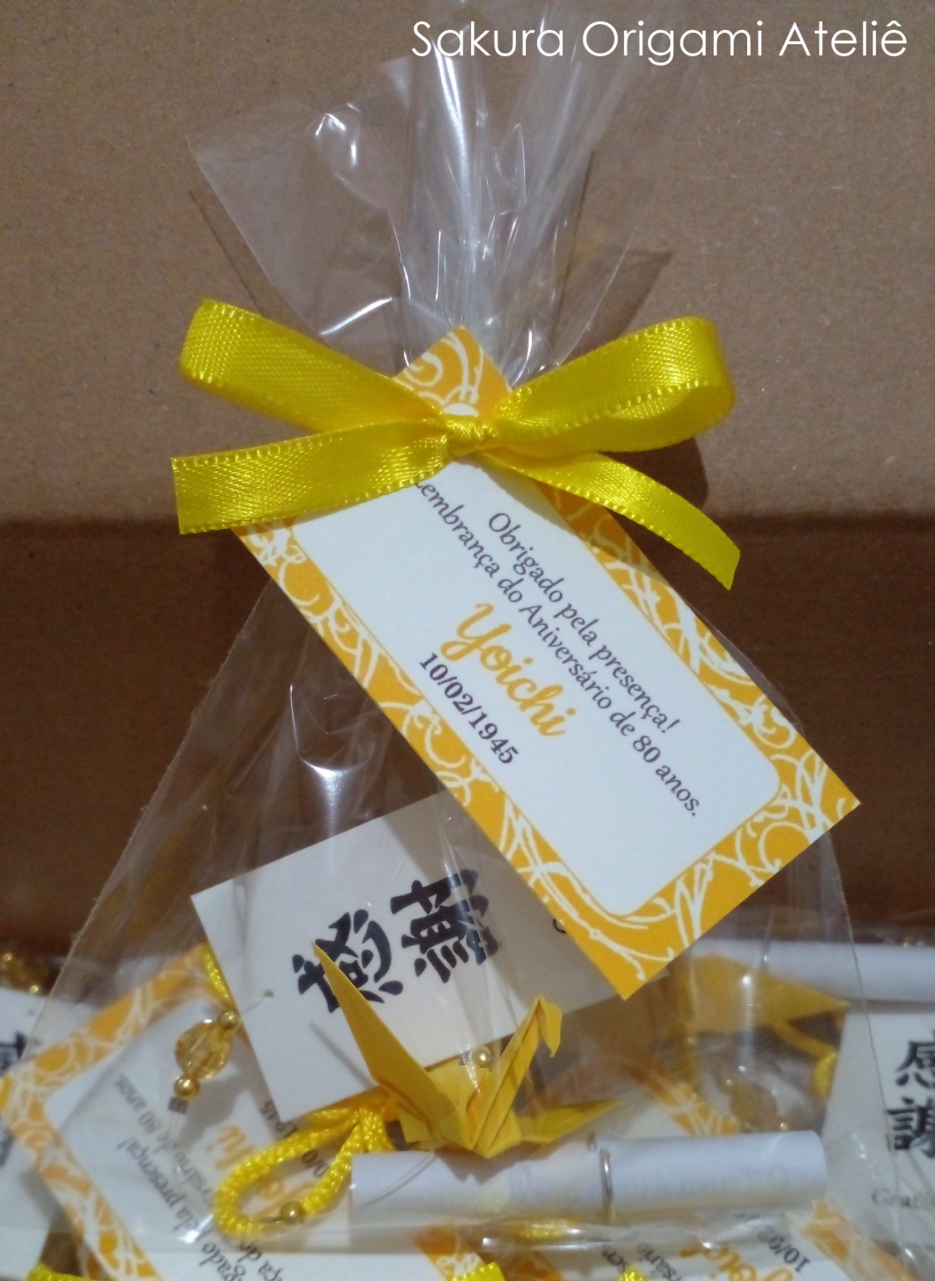 Para deixar ainda mais único, colocamos um kanji (ideograma japonês) na plaquinha embaixo do tsuru. Se preferir, também podemos colocar de um lado o kanji e do outro um nome! Você poderá escolher.