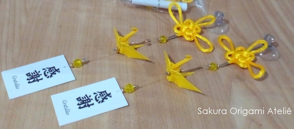 “O Tsuru é considerado uma ave sagrada no Japão que representa paz, longevidade e saúde. O nó chinês significa boa sorte.”